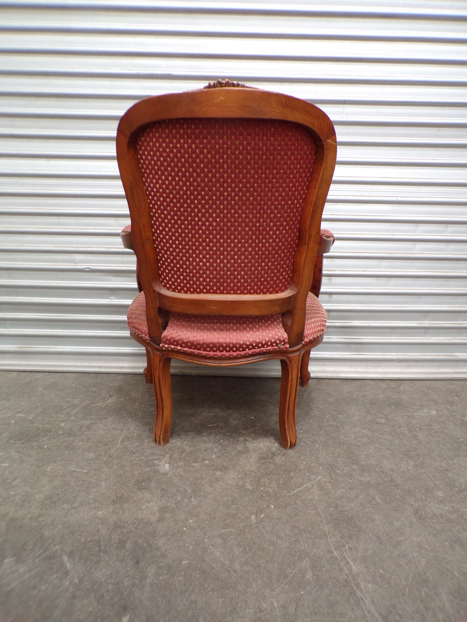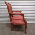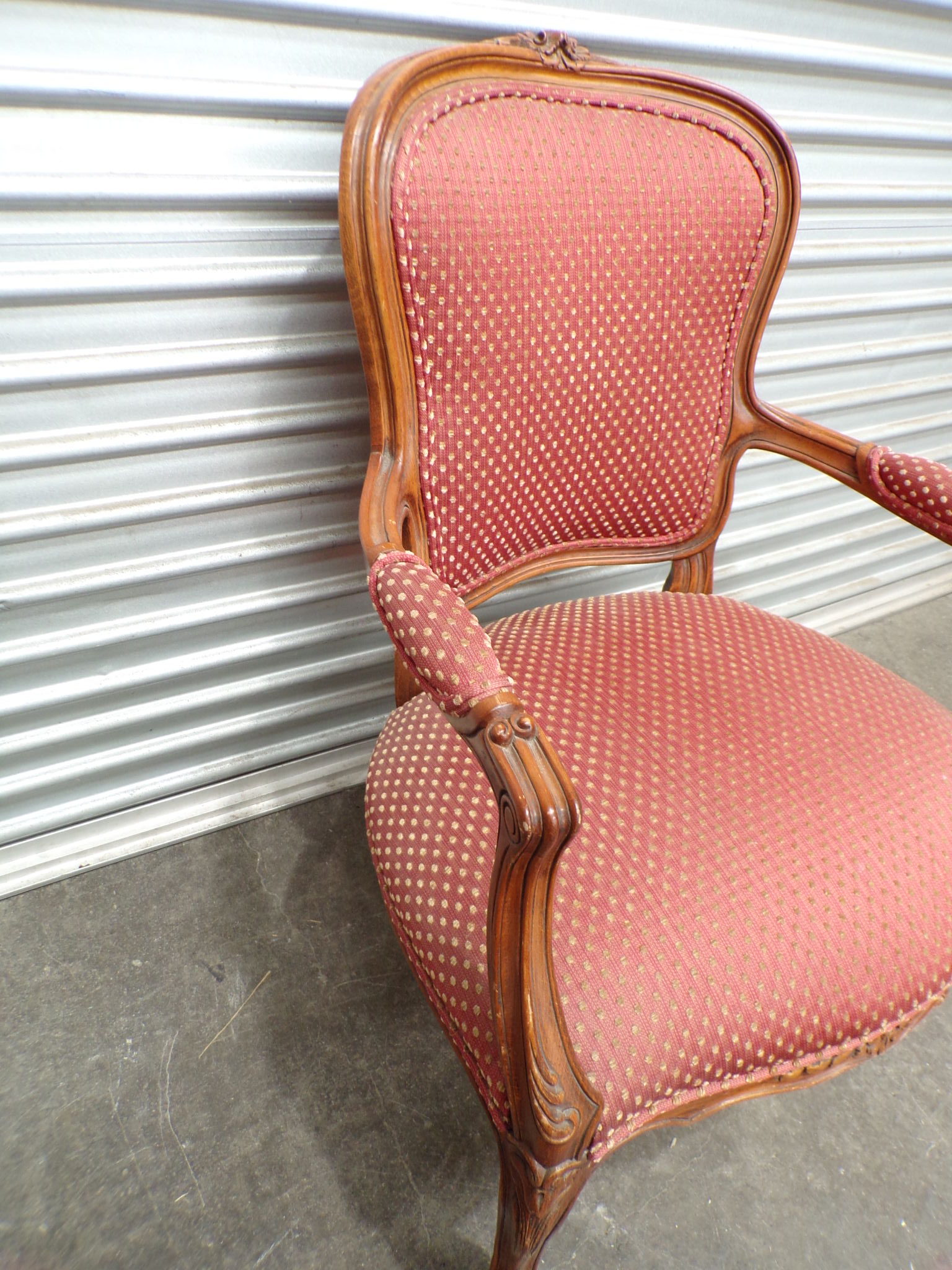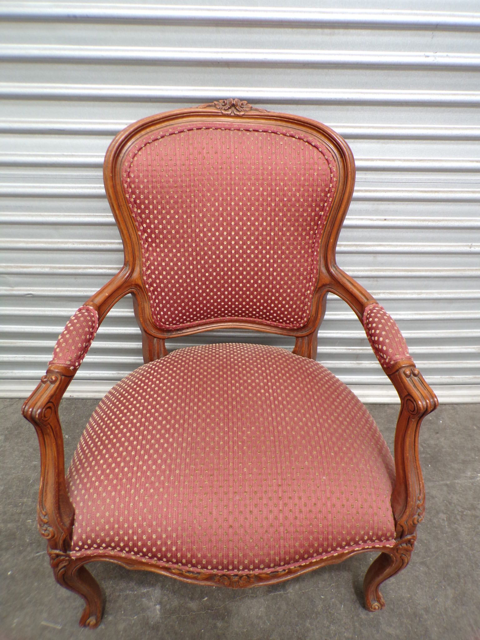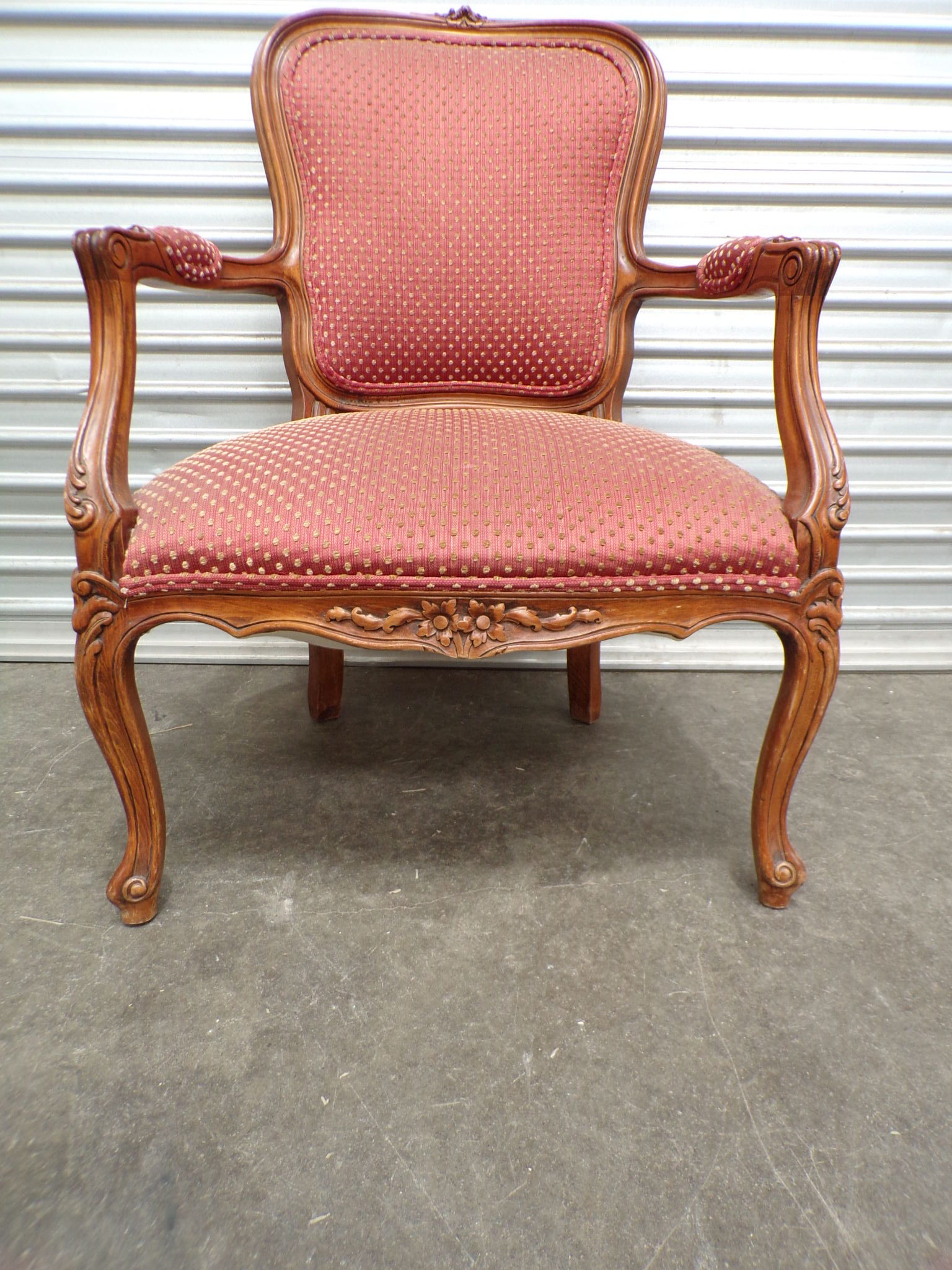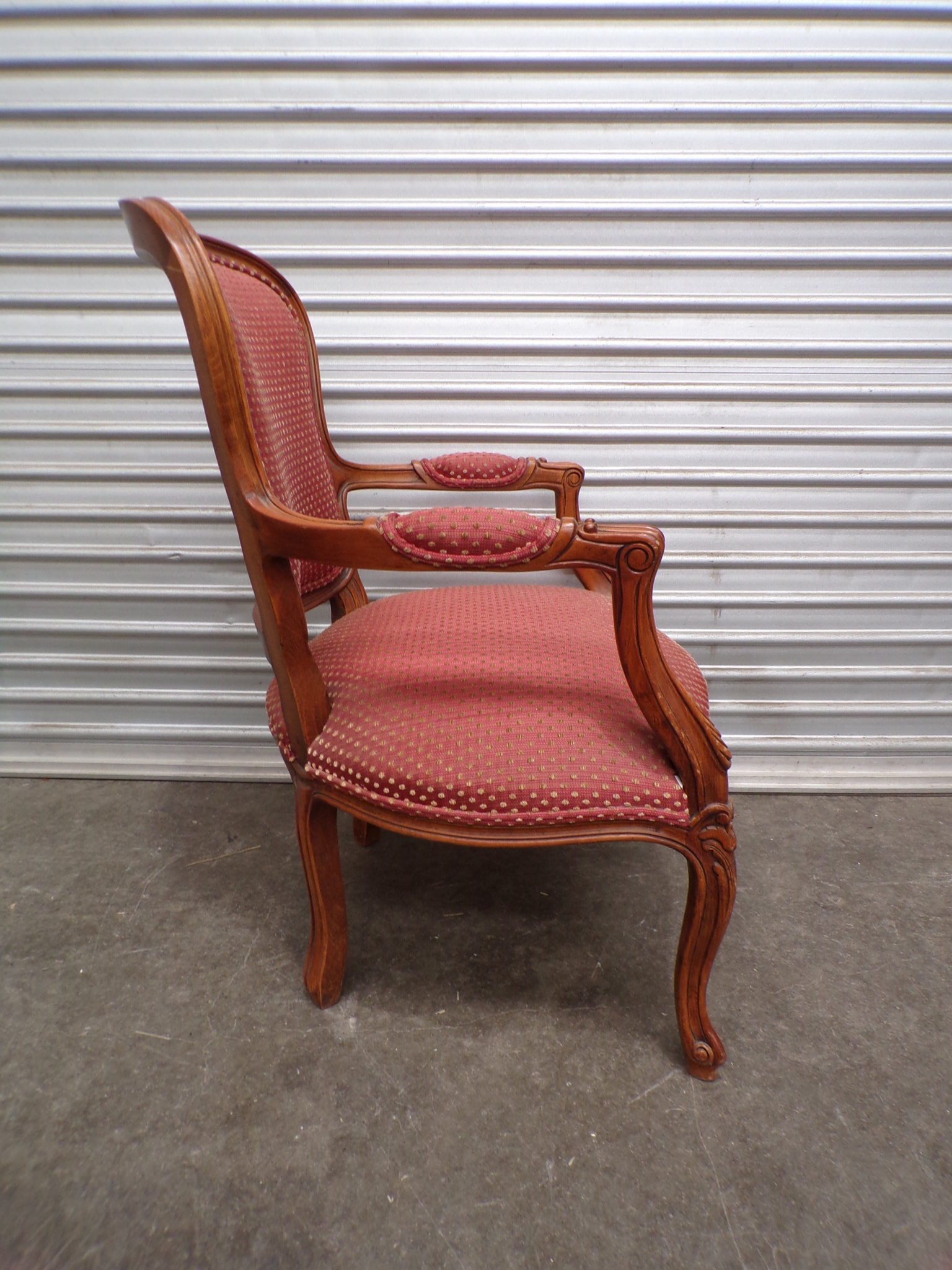 This Louis XV Style Arm Chair has a carved walnut frame and a red patterned fabric upholstery