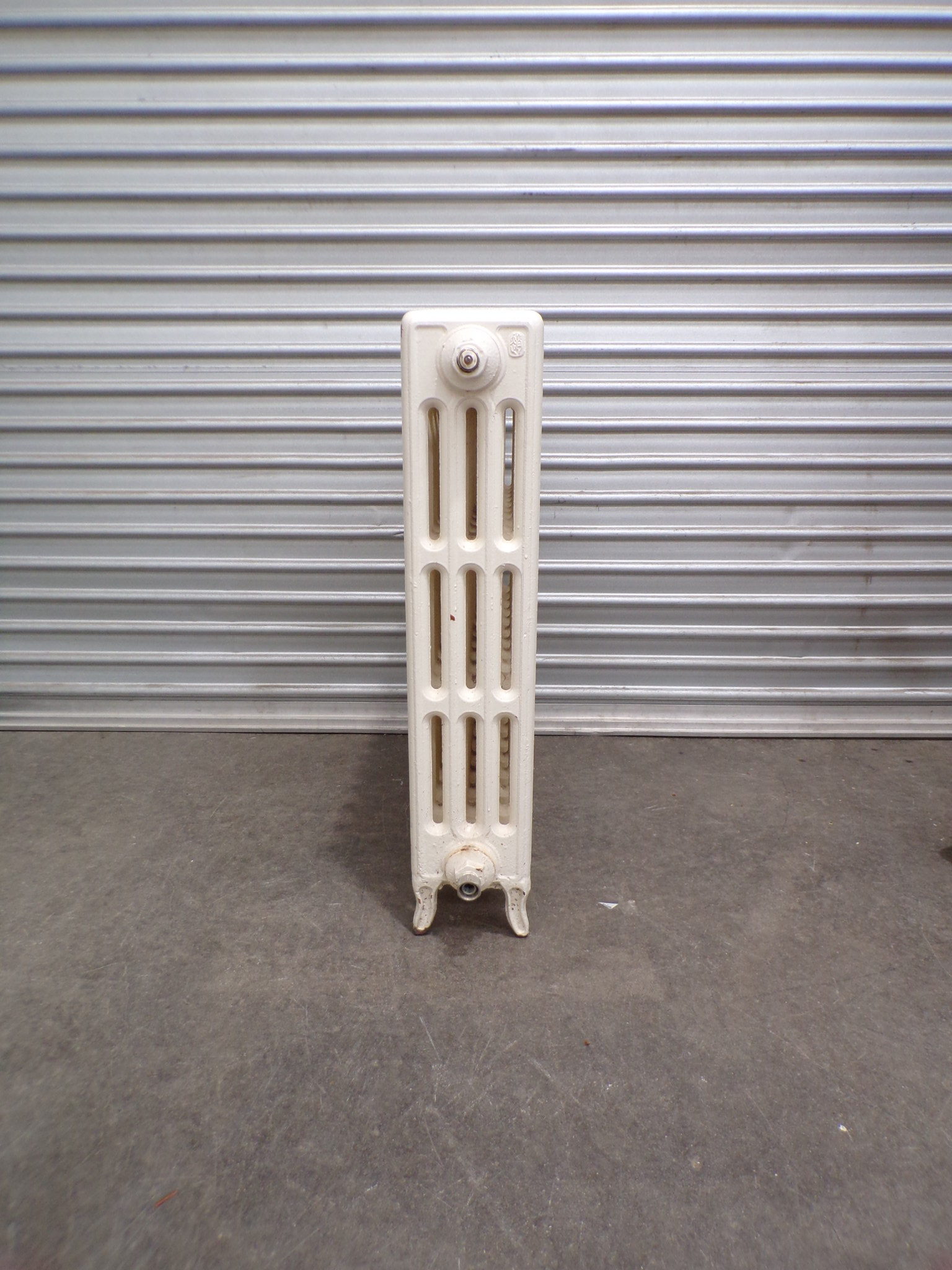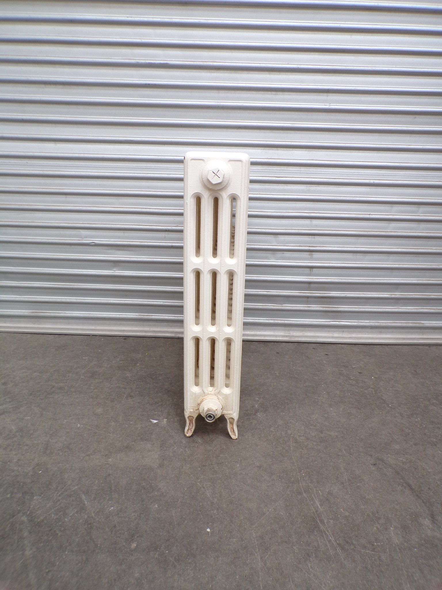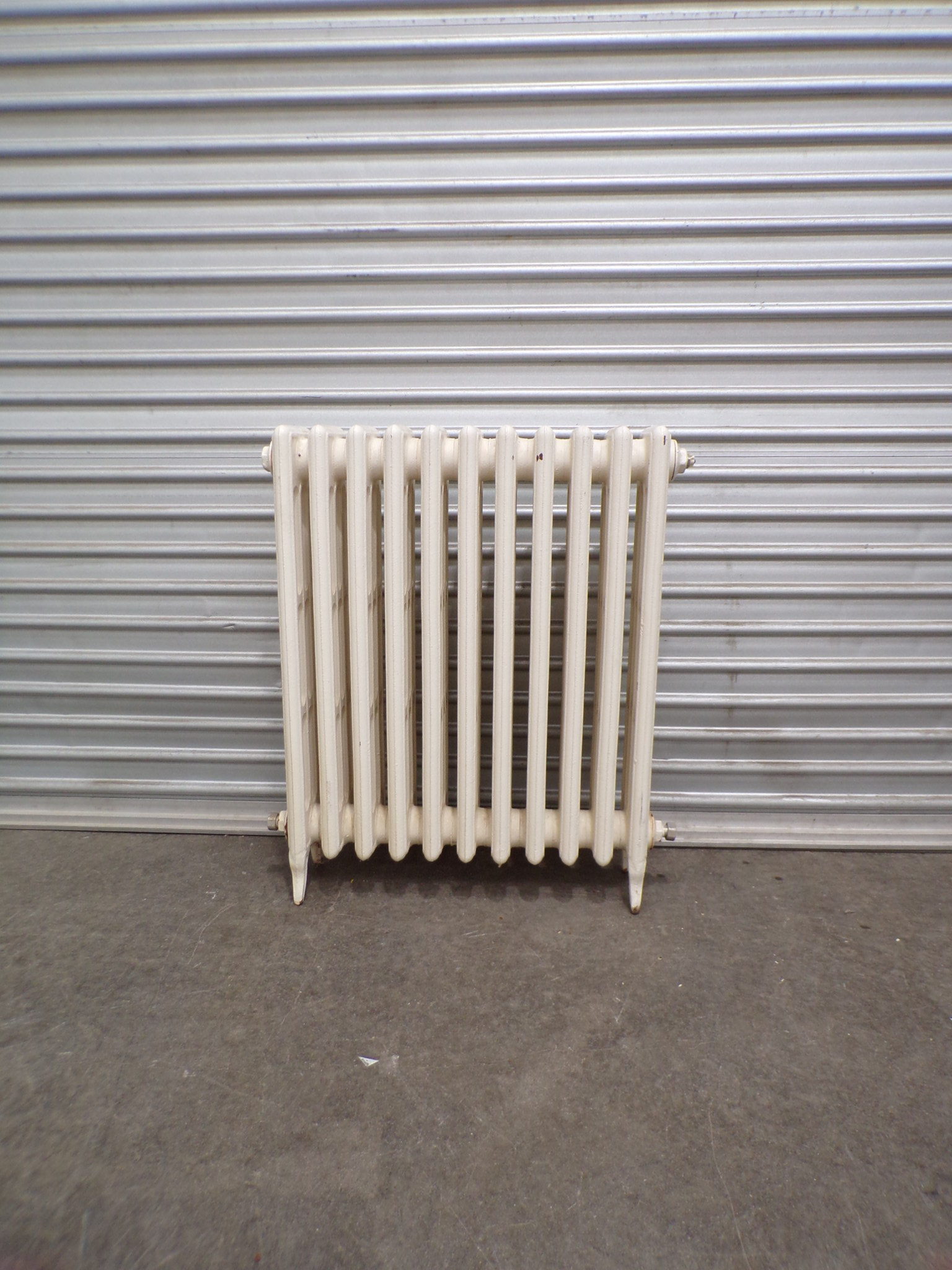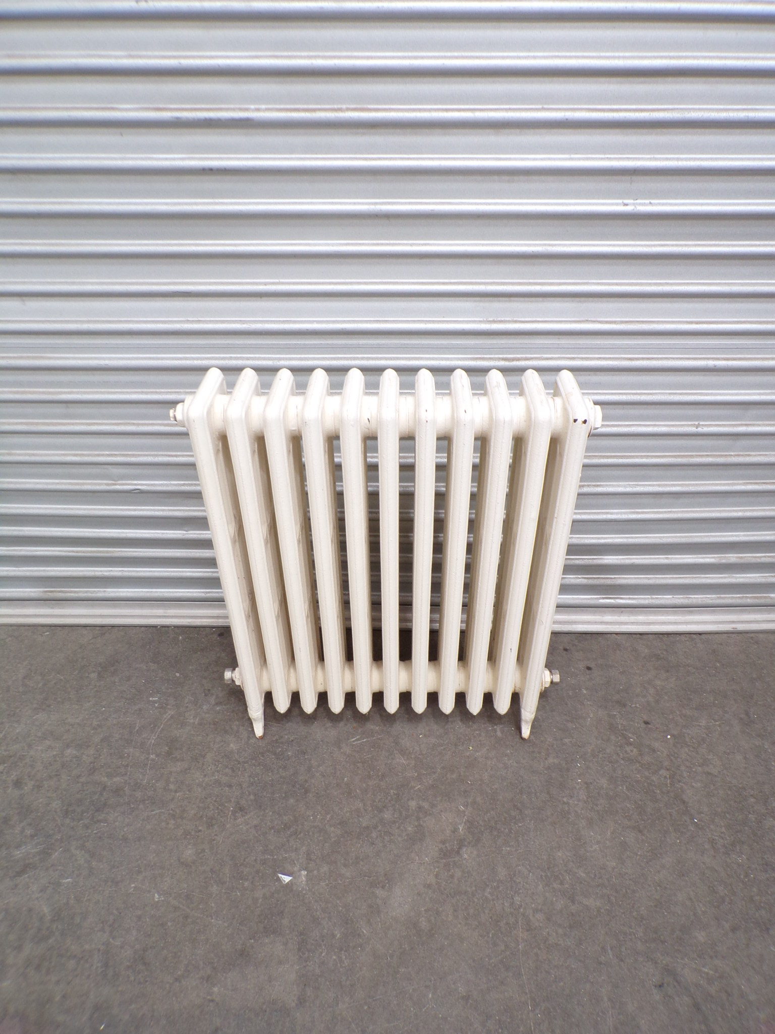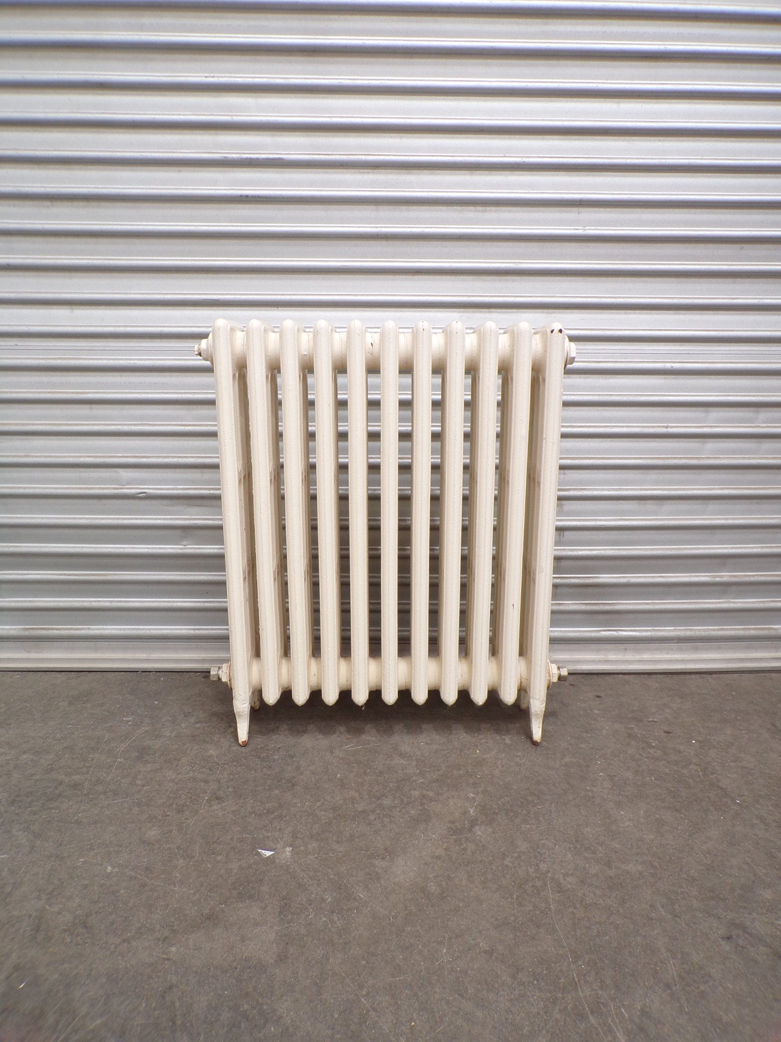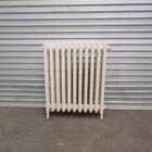 This is a cream, traditional cast iron tubular hydronic heating panel.