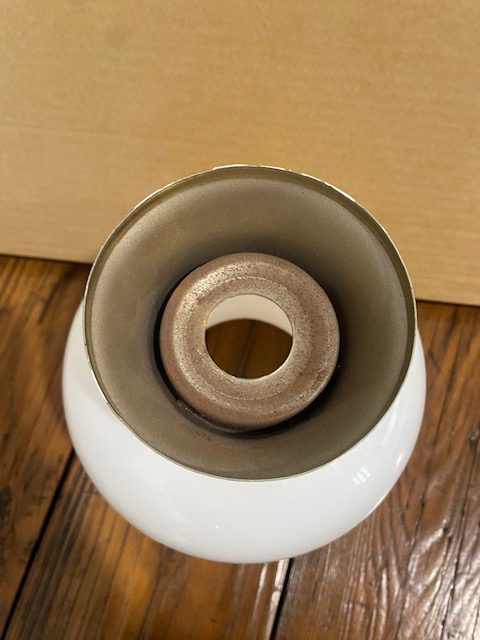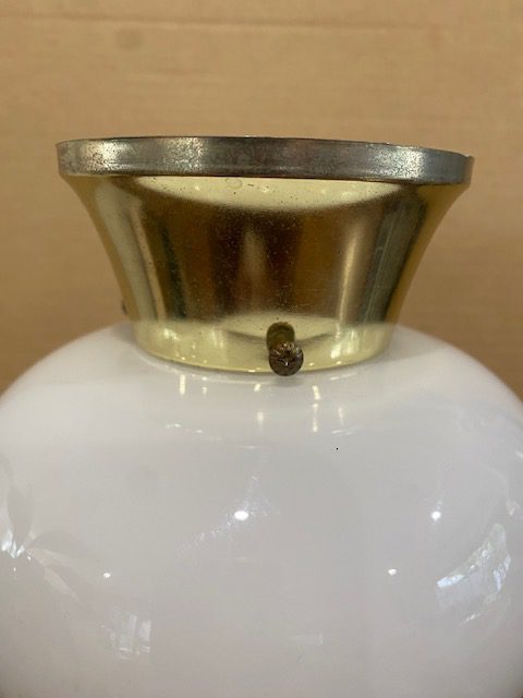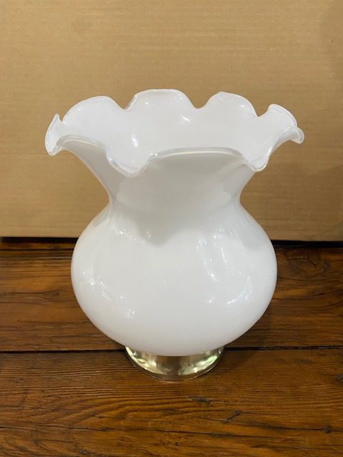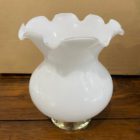 This lovely light has a polished gold ceiling cap and features a white milk glass shade with a frilled rim