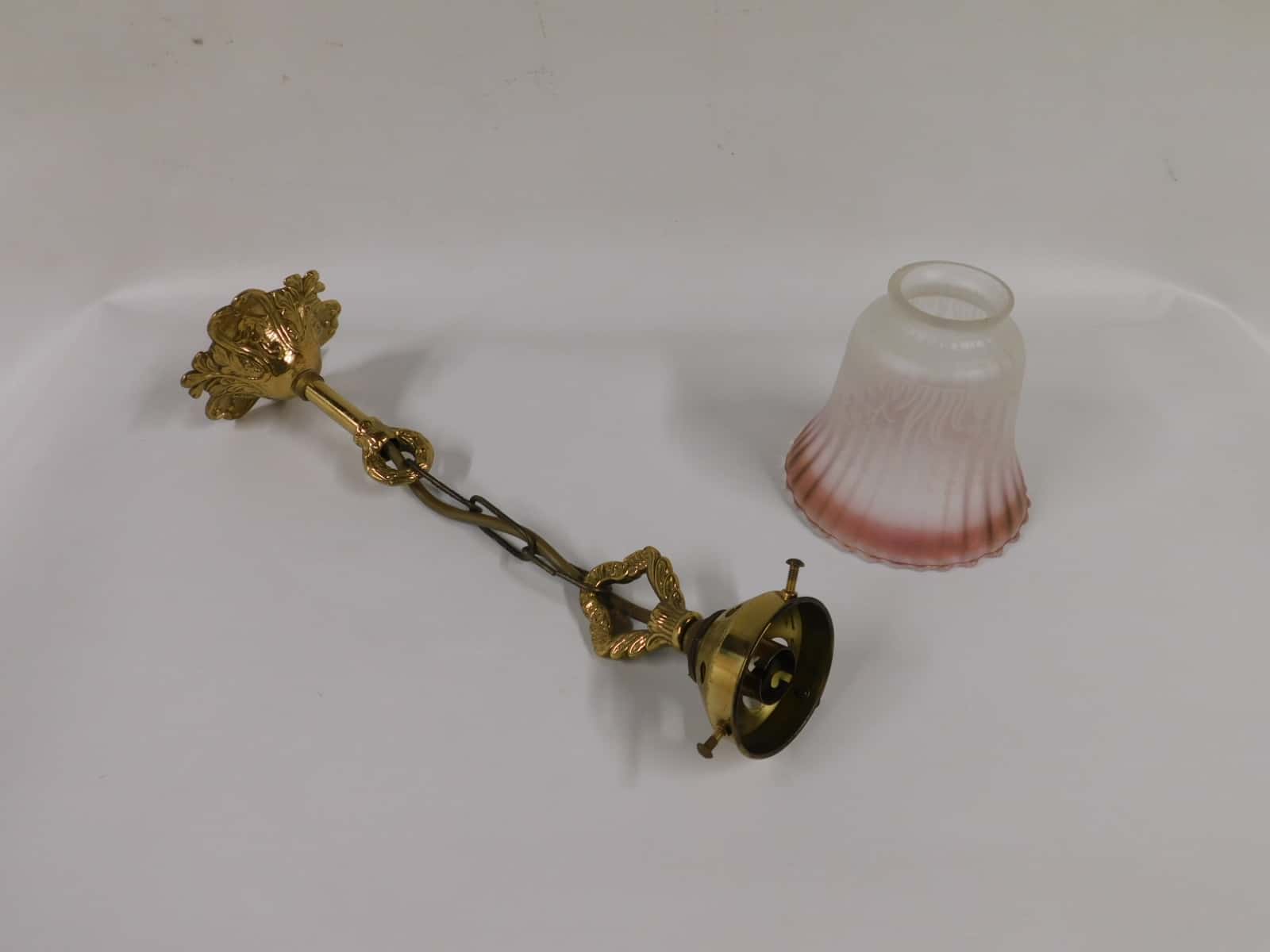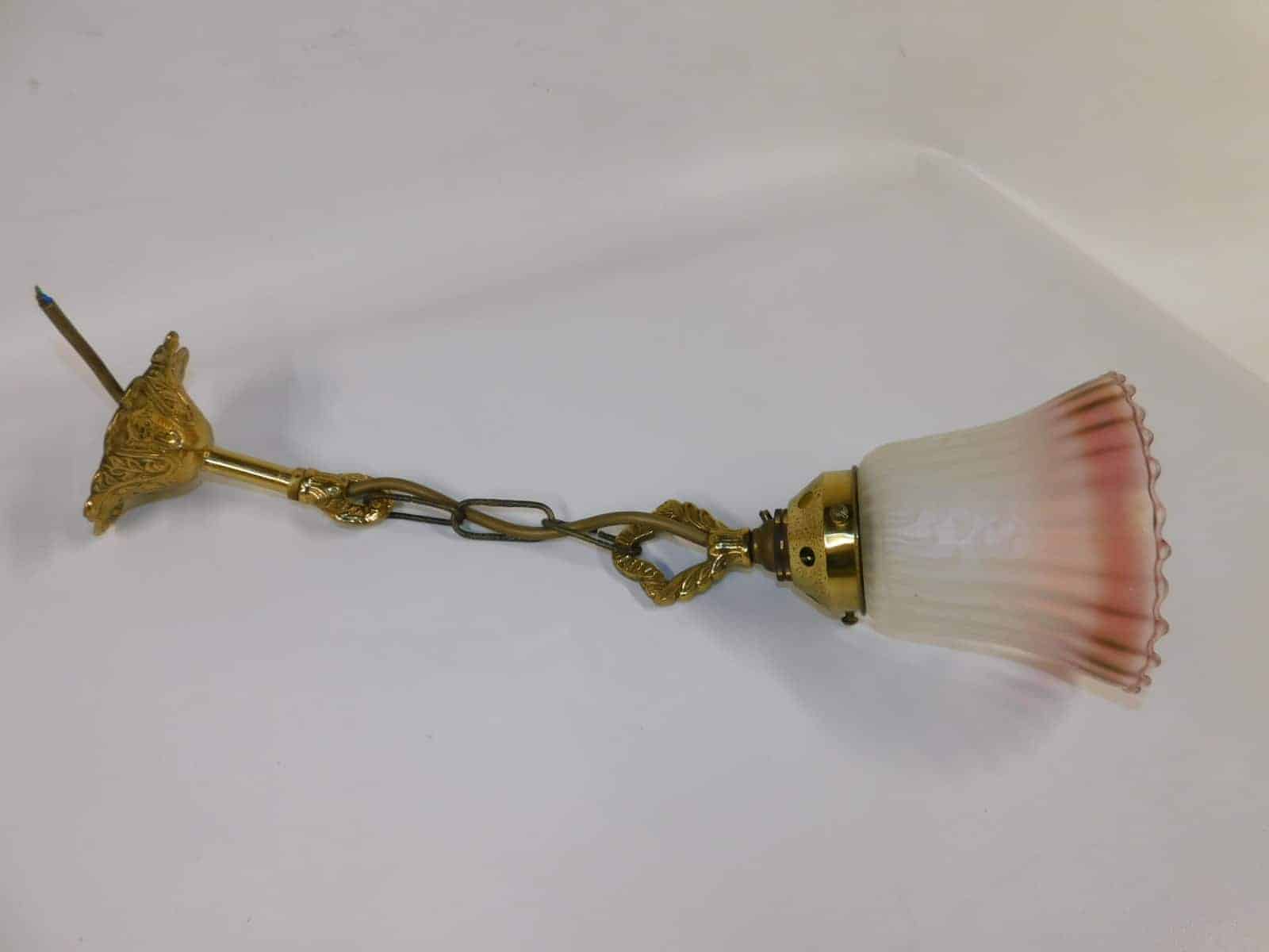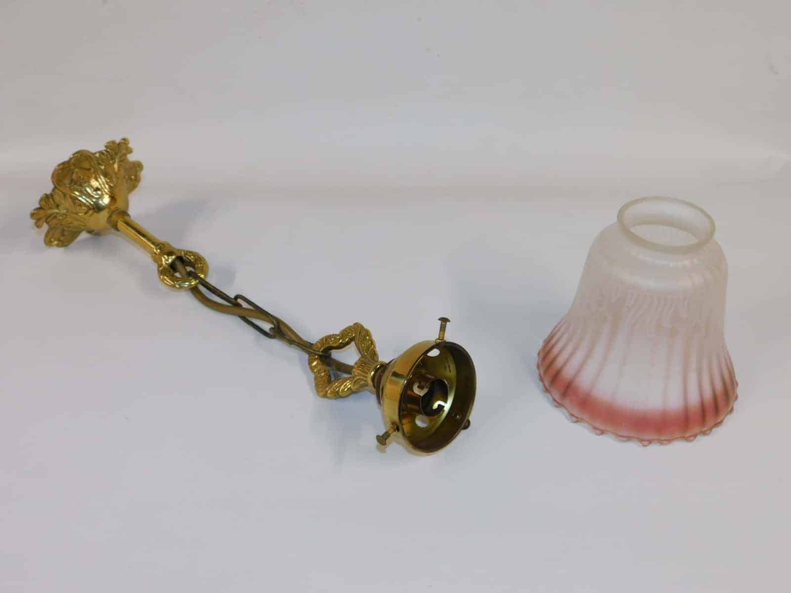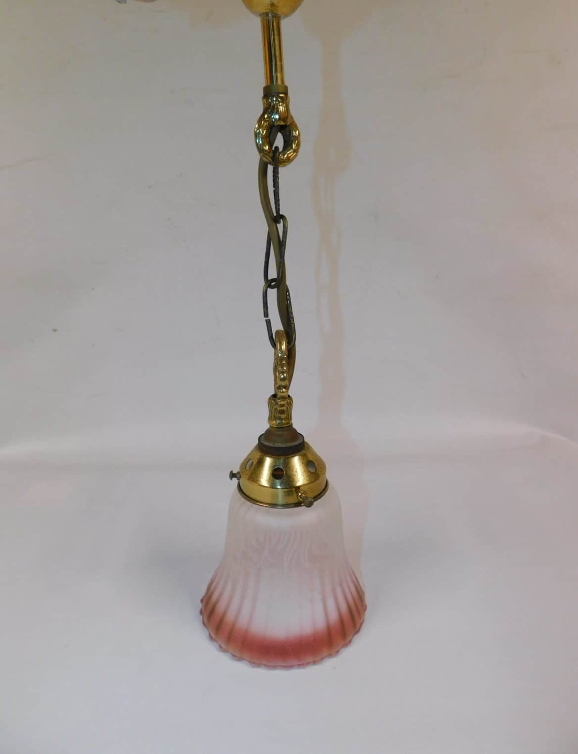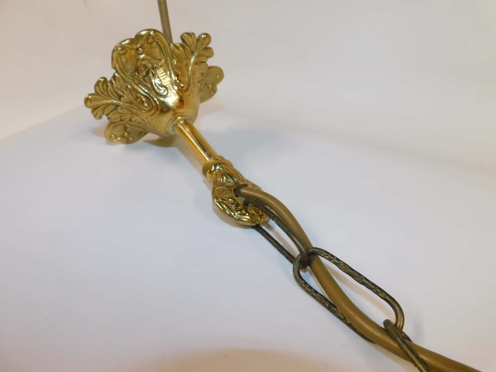 This stunning pendant light from a Victorian Home has an ornate brass ceiling cap and the shade hangs from a gold chain