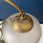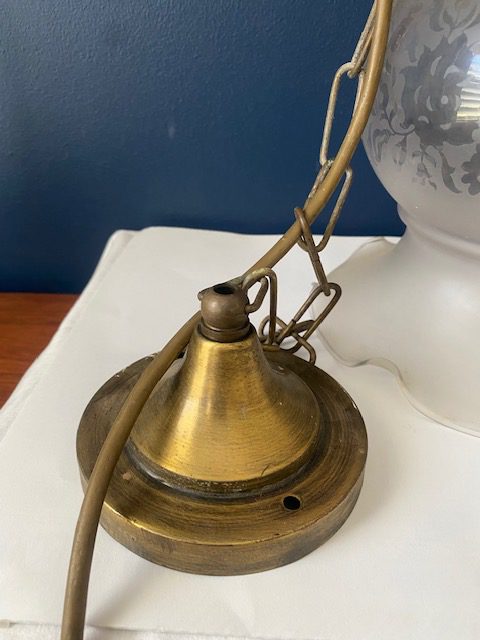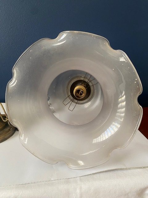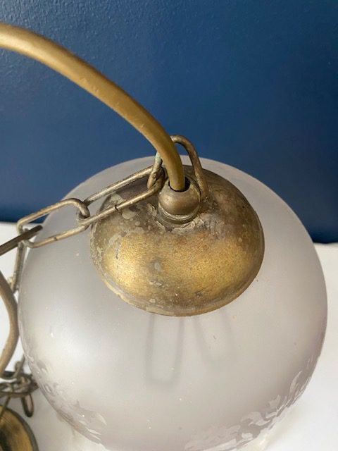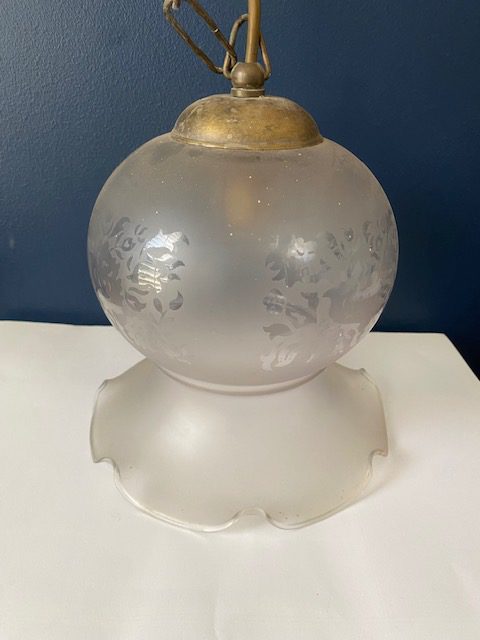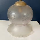 This lovely light has a brass ceiling cap and chain and features an etched glass shade with a frilled rim