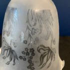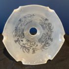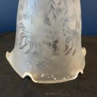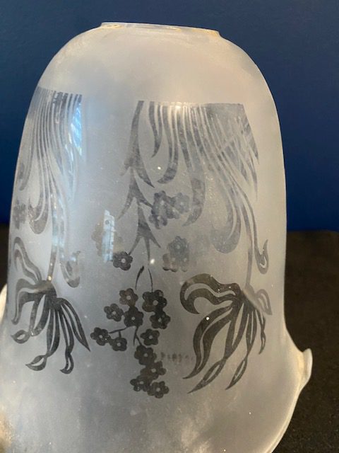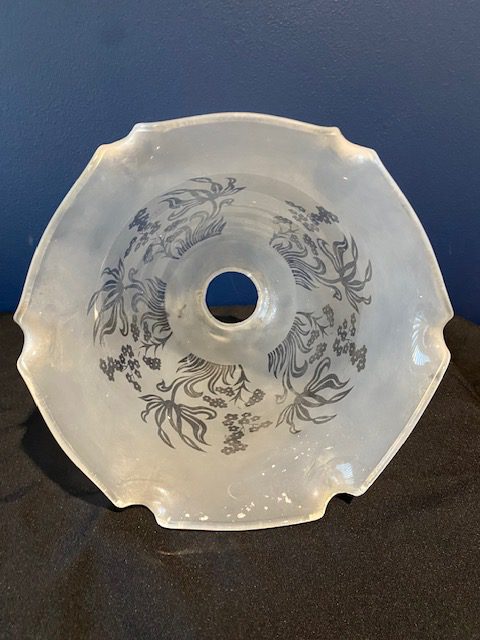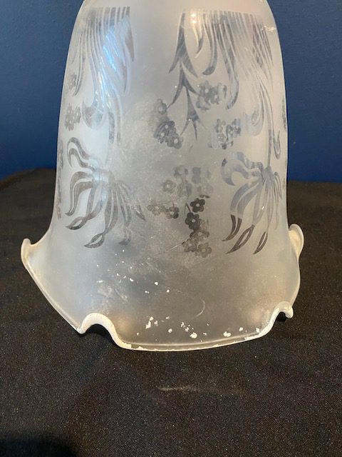 The shade features etched glass with a flower pattern and and a pressed rippled rim