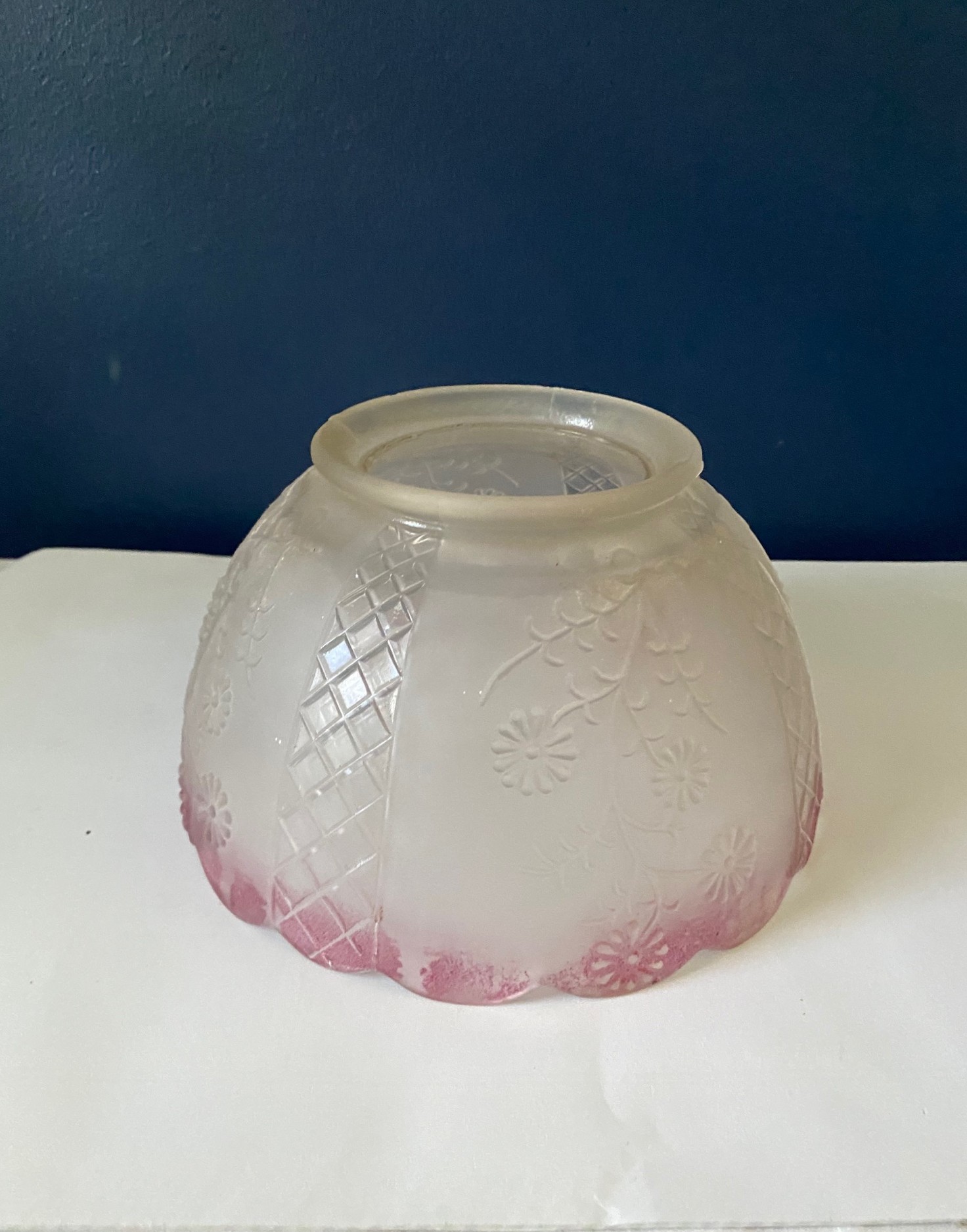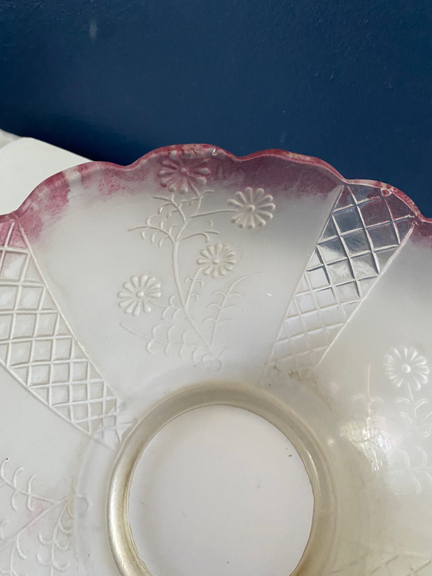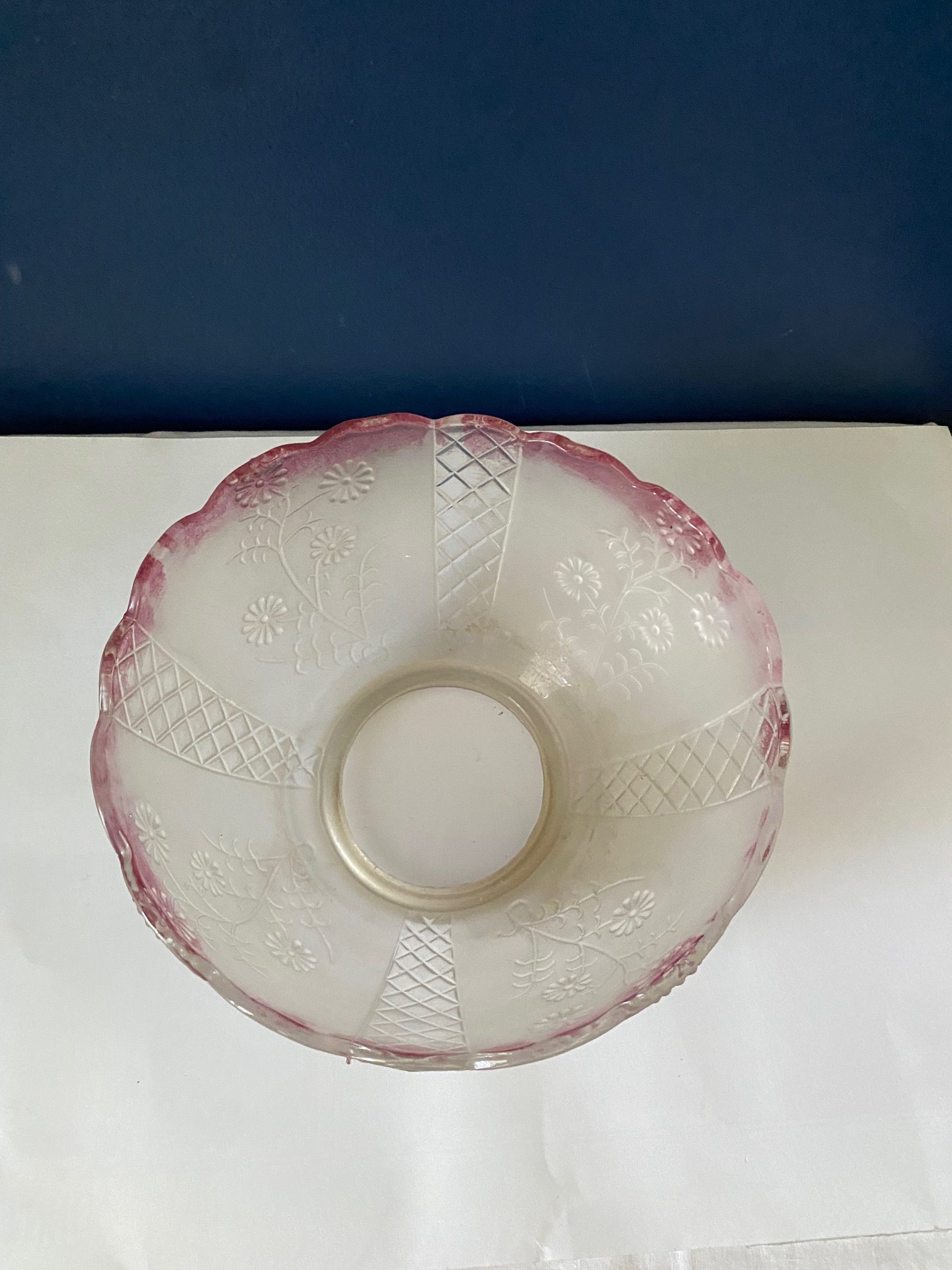 It features a ruby pink edge and the shade has a etched glass in a geometric pattern