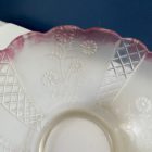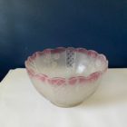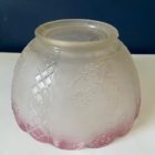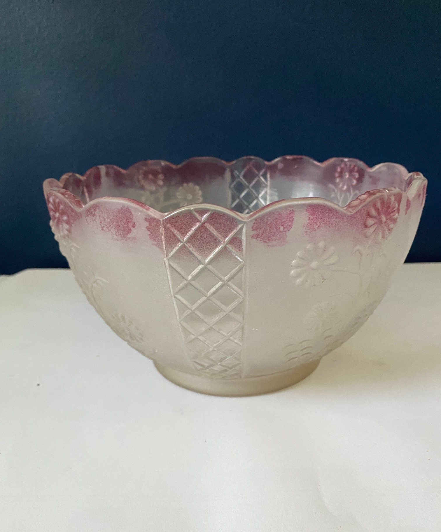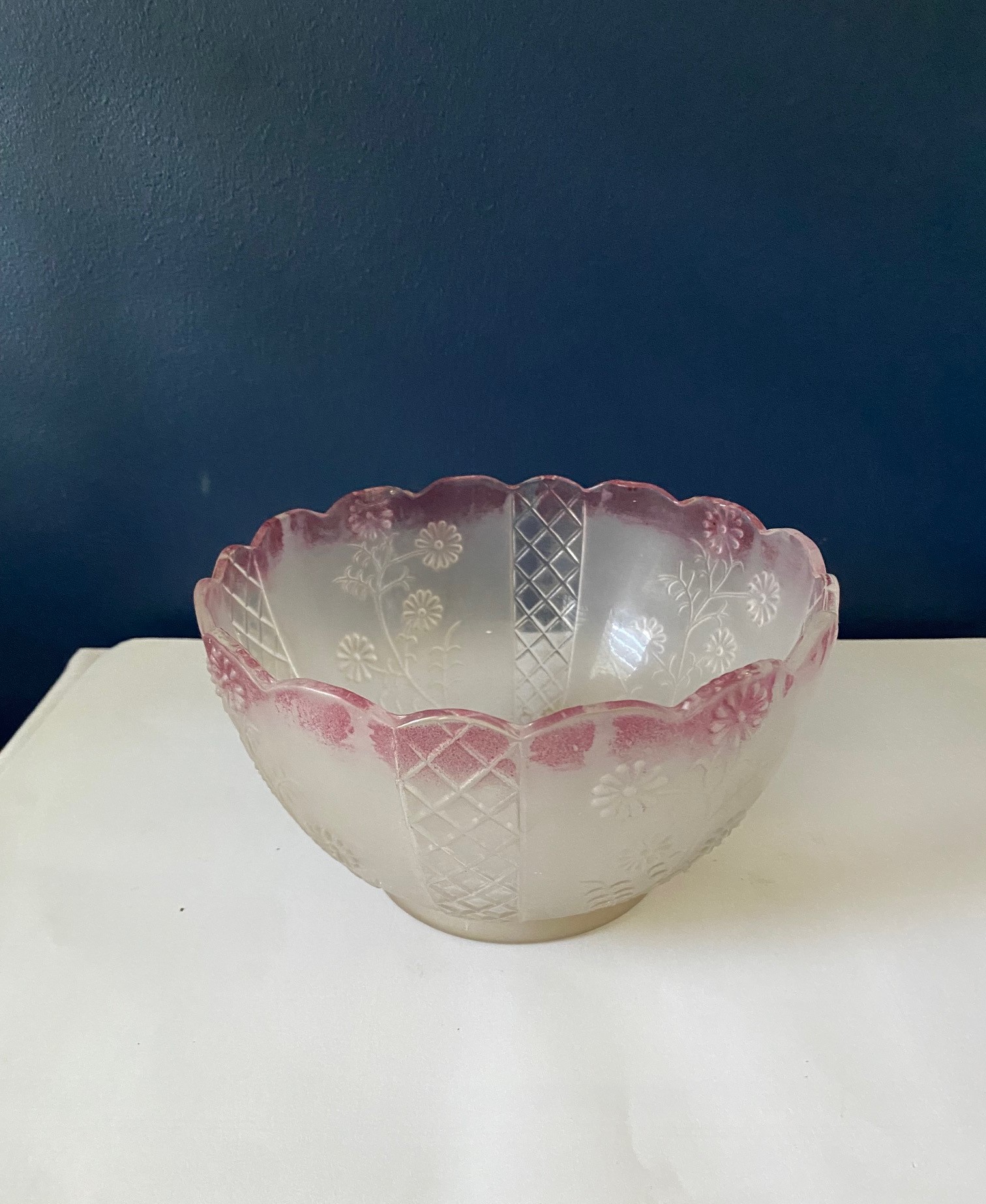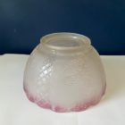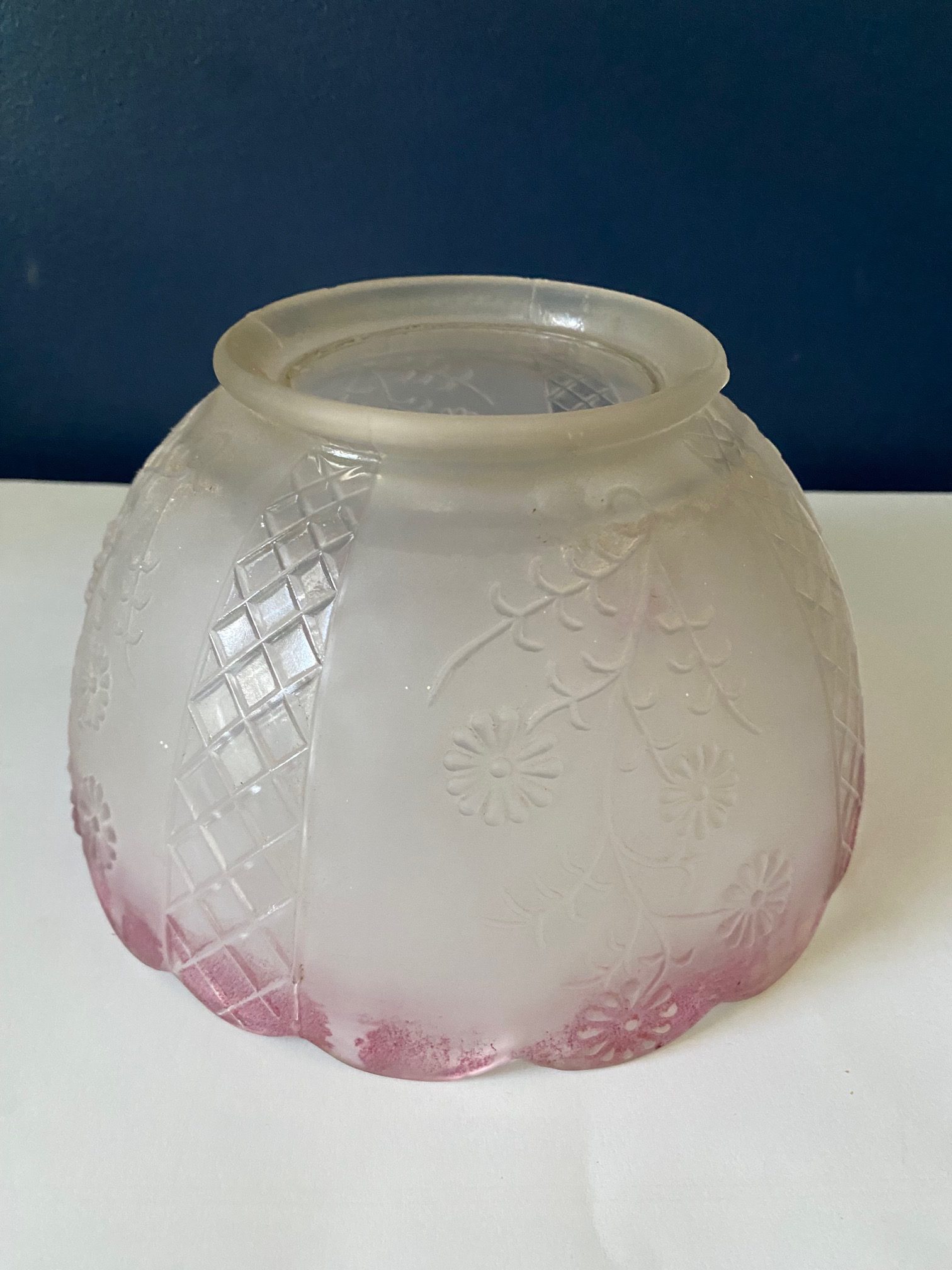 It features a ruby pink edge and the shade has a etched glass in a geometric pattern