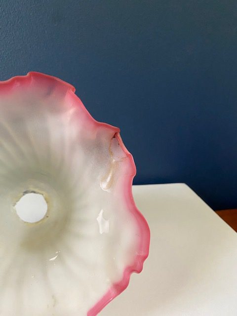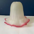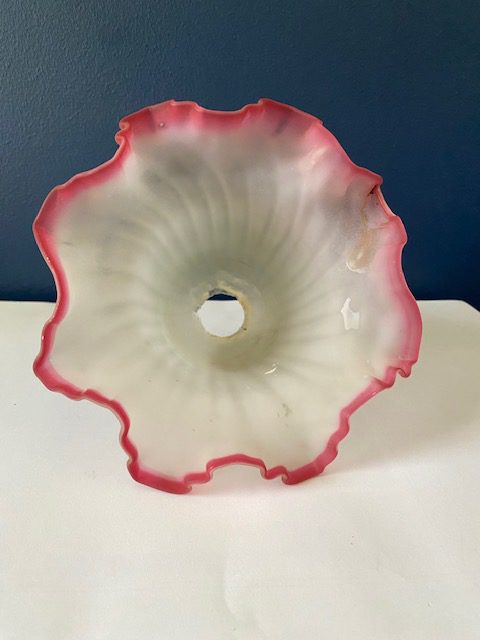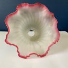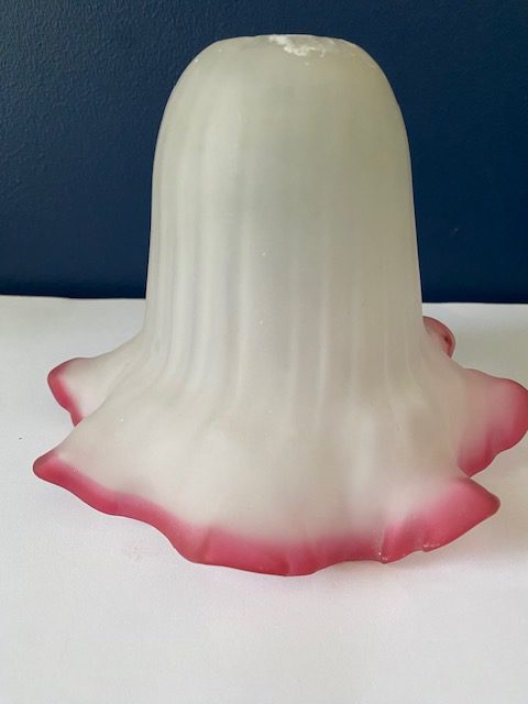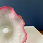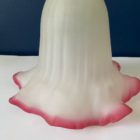 This lovely opaque ribbed glass shade features a ruby pink scalloped edge