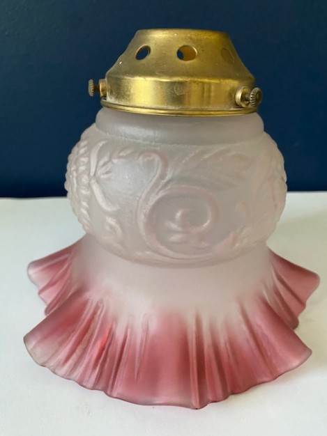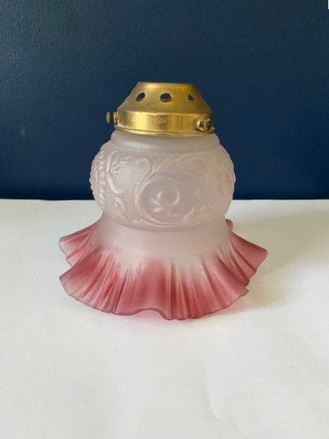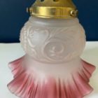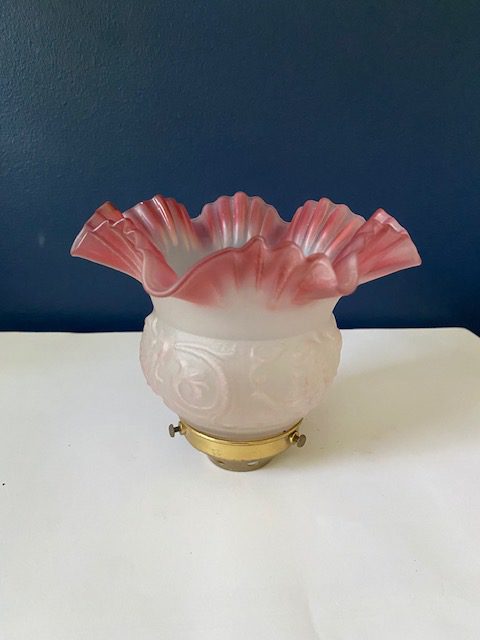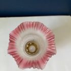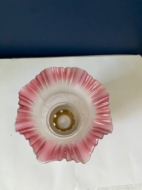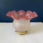 This lovely opaque glass shade features a frilled ruby pink edge and the shade has an embosed floral pattern.